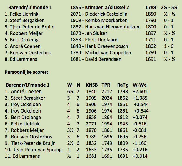 We begonnen licht gehandicapt doordat Iroy ziek werd en ter elfder uren moest worden vervangen door Ed. Hierdoor schoof Tjerk-Peter door naar het derde bord. JC’s oordeel was: “Voordat ik een fout maak, maak ik die fout niet”, maar Tjerk-Peter was dit even vergeten. Zijn toren drong binnen op e2, een vergiftigd veld. JC: “Tjerk-Peter ging het pas zien als ie het door hebt” (0-1).