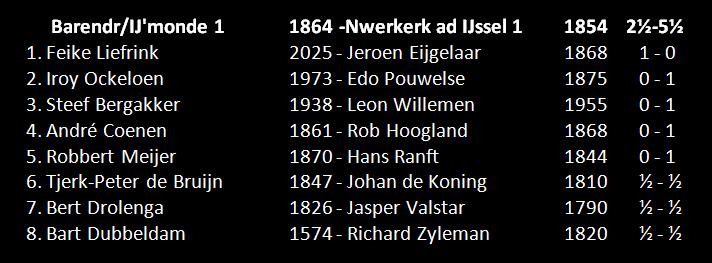 Bert wist namelijk een pion te winnen nadat hij moeilijk uit de opening was gekomen. Helaas kon ik hiermee niets beginnen. Wit bleef druk houden op mijn stelling waarna ons niets anders restte dan de zetten te herhalen. Ook ik herhaalde hiermee ik mijn resultaat van afgelopen jaar (2½-3½).