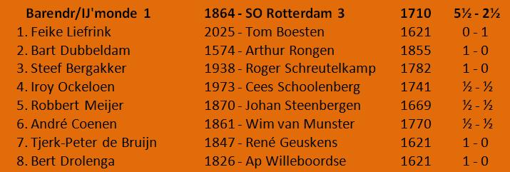 Een grote meevaller was de snelle overwinning van Bart die aan een hoog bord vooruit had gespeeld. Al na acht kwartier spelen kon hij Tjerk-Peter appen: “Ha Tjerk, ik heb om 10 uur voor het eerste punt gezorgd. Hij zag een dubbele aanval over het hoofd, dus ik won een volle toren. Meer kan ik niet doen. Jullie mogen de kill geven. Groeten Bart”.