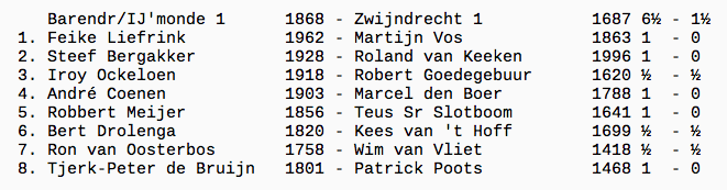 Als laatste was Iroy nog bezig. Hij stond een kwaliteit achter. Bij Iroy doet het vreemde voor dat hij in tijdnood koelbloedig blijft en steeds beter gaat spelen. De ene na de andere pion werd opgepeuzeld. Uiteindelijk bleven een Koning en een Paard tegen alleen een Koning over (6,5-1,5).