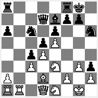 Het is duidelijk dat wit het gemunt heeft op pion h3. Hoe komt die pion daar en wat moet ie daar? Dat vroeg ik mij hier ook af. Feit is dat ie daar al sinds de 9e zet bivakkeert en dat ie de partij zal gaan beslissen. Zoals gezegd, ik maakte me toch wel wat zorgen, met name om voornoemde pion h3 (anders dan de computer trouwens). Ik dacht hier na over 20. …, f6 en 20. …, f5. Om mij onbekende redenen speelde ik 20. …, f5?. Waarschijnlijk leefde ik teveel in de veronderstelling dat wit toch wel en passant zou slaan (als je die kans krijgt, dan grijp je die toch?), maar 20. …, f6 is natuurlijk veel beter. Als de pion op h3 er al afgaat, dan heeft zwart behoorlijk compensatie in de vorm van aanval op de witte koningsstelling (bijvoorbeeld: 20. …, f6 21. exf6, Lxf6 22. Dh5, Df7 23. Dxh3, Lxd4; zeker niet zomaar gewonnen voor zwart, maar wit heeft het niet gemakkelijk). Na 20. …, f5 is alles anders, wit staat veel beter, nu ook volgens de computer. Het vervolg: 21. Dh5, f4 (dan maar in troebel water vissen) 22. Pg4 (22. Pd1!), Pxg4 23. Dxg4, fxg3. De volgende stelling is nu ontstaan: