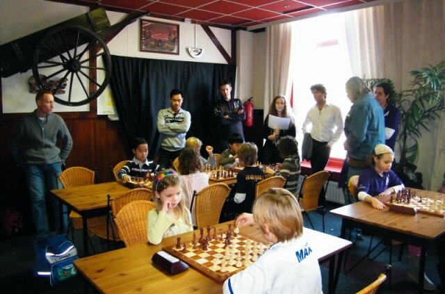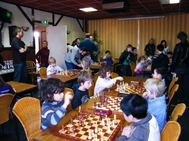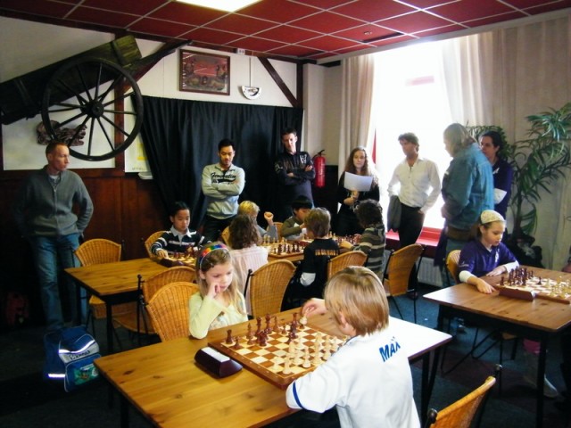 Om 13:00u verzamelden zich ongeveer 30 schakertjes in de gezellige speellokatie van schaakvereniging Sliedrecht. Evenzoveel ouders probeerden zo dicht mogelijk bij de borden te staan. Ouders met ervaring op het voetbalveld wonnen, door hun ervaring, direct de strijd met de anderen. Met vier arbiters op 30 m2 werd al snel korte metten gemaakt met de luidruchtige aanwijzingen en goedbedoelde aanmoedigingen, twee gele kaarten en een uitsluiting zorgden voor de nodige rust rond de borden.
