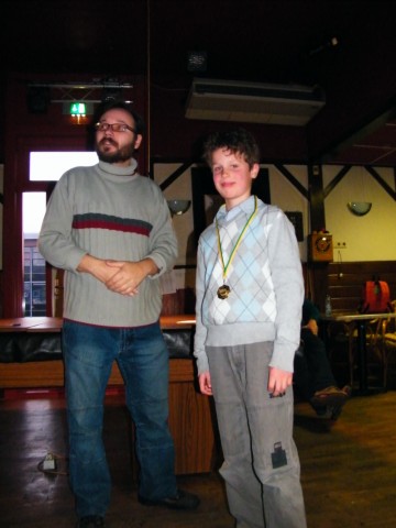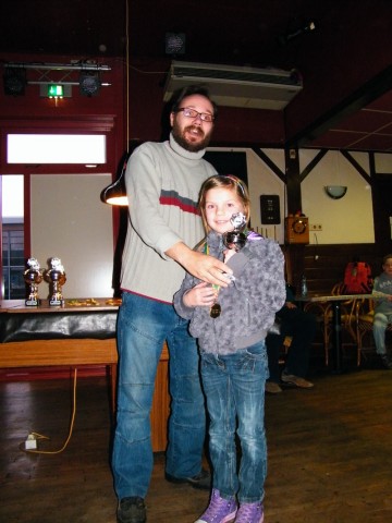 In een halve competitie mocht iedere speler eenmaal tegen alle andere spelertjes in zijn eigen groep. Clemens begon enigszins nerveus en liet zich in de eerste ronde inpakken. De volgende ronden ging het gelukkig een stuk beter en wist hij indruk te maken. Uiteindelijk eindigde Clemens als vierde en net buiten de prijzen. Met een mooie medaille om zijn nek wist hij me te verzekeren dat hij volgend jaar wel een beker zou meenemen! Het talent is er, nu nog even flink trainen.