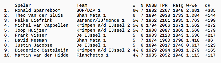 Op de wedstrijddag meldde André zich ziek, waardoor Pieter zijn debuut kon maken in het eerste. Hij speelde met open vizier, maar helaas ook met een open koningsstelling. Een venijnig loperoffer op f7 spleet zijn koningsstelling open waarna Pieter de boel niet meer droog kon houden.
