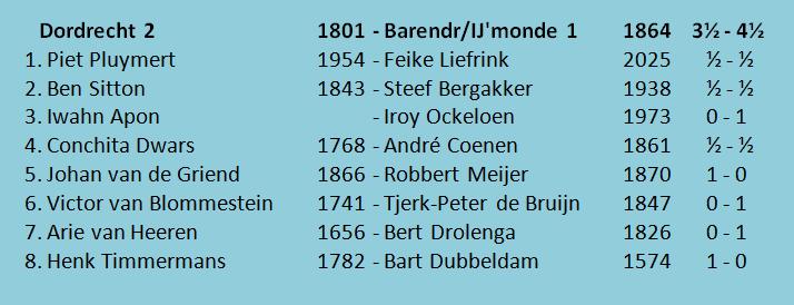 De laatste, Tjerk-Peter dus, speelde een paar octaven te laag. Hij kwam tegen zijn snel spelende tegenstander al rap een pion, mineure stelling en heeeel veeeel minuten achter. Op een gegeven moment stonden beide klokken op 0,59. Alleen bij Tjerk-Peter waren het seconden en bij Victor minuten. In het toreneindspel bleef Victor fortissimo spelen. Te fortissimo. Tjerk-Peter slaagde er miraculeus in om de witte koning mat te zetten. Een wel heel belangrijk puntje (1½-½).