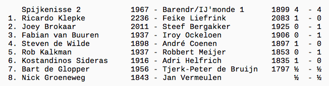 Steef Bergakker speelde op bord 2 tegen Joey Brokaar een sterke partij. Vanuit de Nimzo Indische verdediging ontstond een gesloten stelling. Joey had op een gegeven moment steeds de 15 seconden bonustijd nodig om zijn volgende zet te kunnen doen. Dit kon natuurlijk niet eeuwig doorgaan en zijn witte koning werd midden op het bord pardoes mat gezet (3-4).