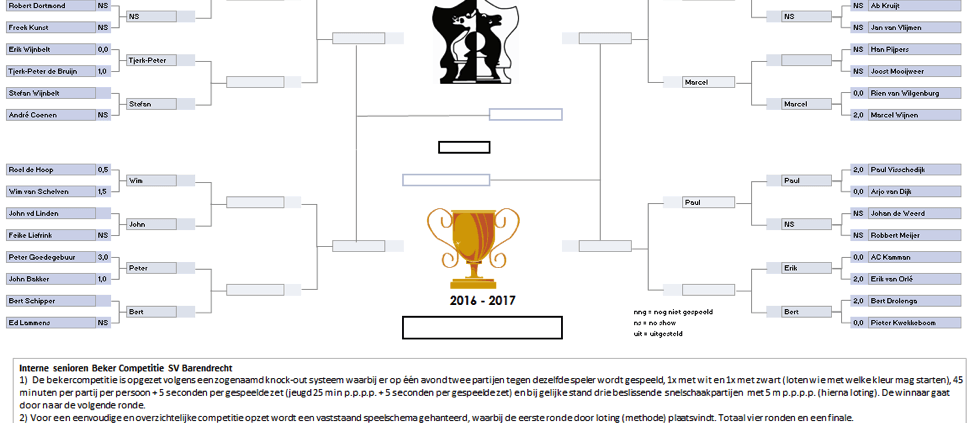 Helaas was er een groot aantal ‘No Shows’. Hierdoor is Marcel al zeker van een plaats in de halve finale, te spelen op 15 mei 2017. Zijn tegenstander wordt of Paul, of Erik van O., of Bert D.