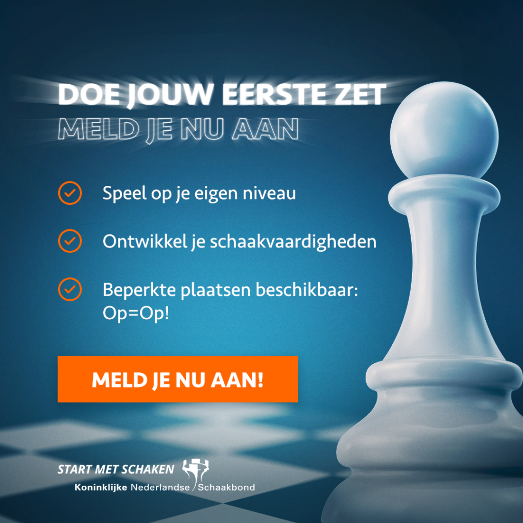 Wil je kennismaken met schaken op een leuke en laagdrempelige manier? Schrijf je dan in voor “Jouw eerste zet”! Gedurende vier avonden (2, 9. 16 en 23 september 2024) leer je de basis kneepjes van het schaken, begeleid door ervaren spelers. Je kunt je aanmelden via: https://startmet.schaken.nl/activiteit-detail?id=527179