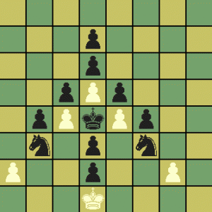 Kerstboomprobleem: zwart is aan zet en zet mat in vier zetten (door M. Stratakis).