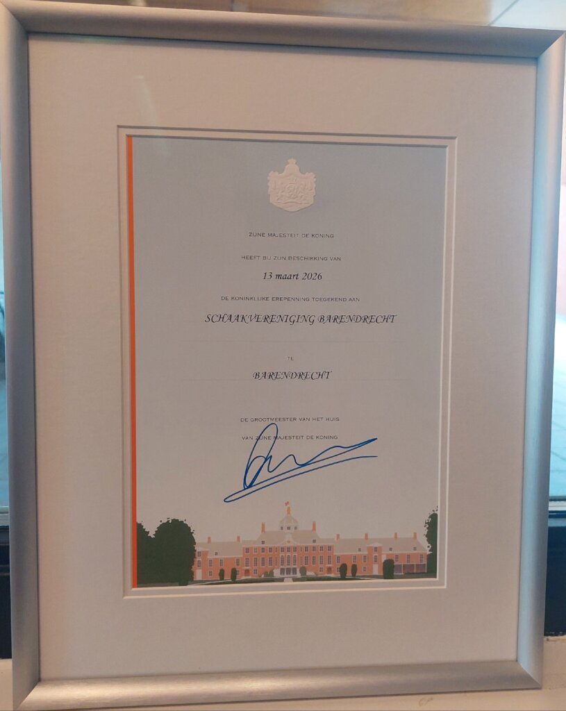 Burgemeester Ronald Schneider heeft op zaterdag 18 april jl. de Koninklijke Erepenning uitgereikt aan onze 50-jarige schaakvereniging Barendrecht.