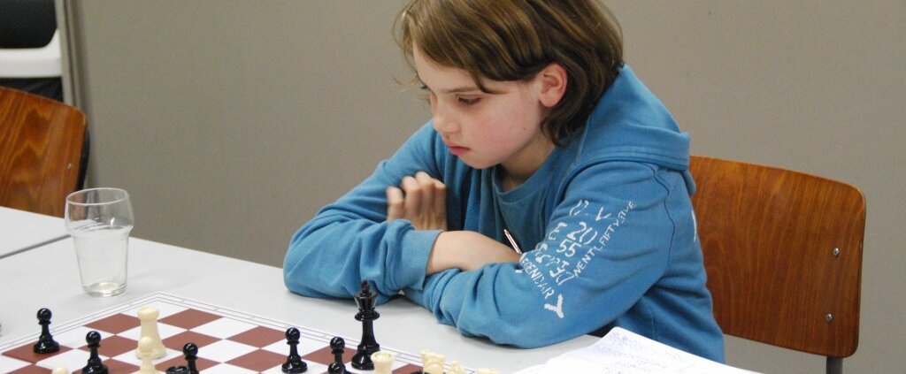 Als een echte grootmeester speelt Stefan Rijshouwer op bord zeven tegen Thijs Verhoef. Half op z’n knieën en voorover geleund over het bord, schieten zijn ogen van a1 naar h8 en weer terug. Met souplesse wordt iedere zet doelbewust gespeeld. De ene na de andere rake klap wordt uitgedeeld. Halverwege de partij lijkt de controle volledig. Stefan verlaat vol vertrouwen zijn bord en loopt door de zaal, iedere partij nauwlettend in zich opnemend. Was het niet Anish Giri die tijdens het Corus-toernooi altijd eenzelfde loopje maakte? Na een mooi schijnoffer van zijn toren, leken de twee vrijpionnen Stefan de overwinning te kunnen geven. Zijn tegenstander voorzag echter deze dreiging en wist als snel een pion terug te nemen en de ander te blokkeren. Plan twee, alle stukken op de koningsvleugel, was voor Stefan een stuk lastiger geworden nadat hij zijn verdediging had moeten opgeven tegen een paard. Met nog een dame, toren en loper wist hij zijn verbaasde tegenstander tot overgave te dwingen. Een sterke en weldoordachte combinatie zorgde uiteindelijk voor dame-winst of mat! Mooi, gedurfd en vooral geconcentreerd gespeeld! Gefeliciteerd!