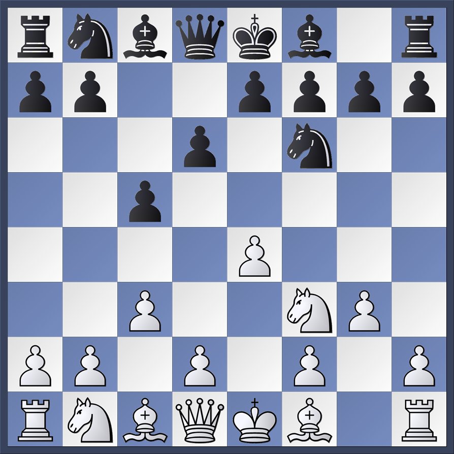 In dat soort wedstrijden ben ik op m’n best. We scoren er met z’n allen lustig op los en ik draag mijn onnodige steentje bij. Dat ging dit keer erg gemakkelijk. Na 1. e4, c5 2. Pf3, d6 3. c3, Pf6 4. g3 was onderstaande stelling ontstaan.