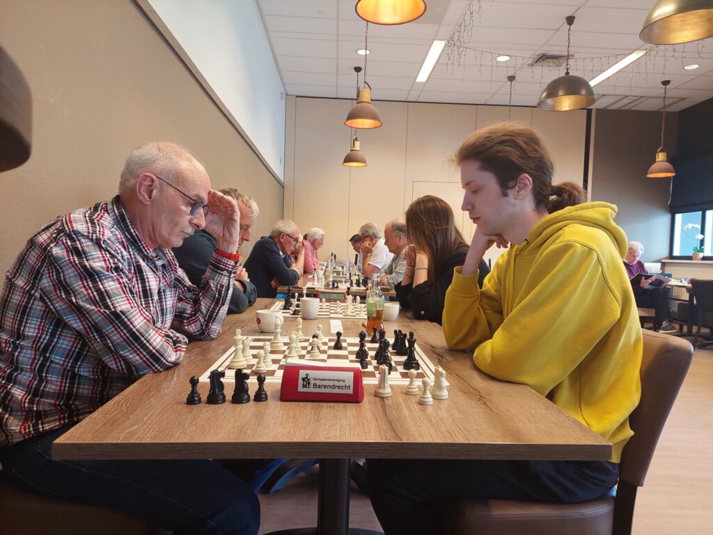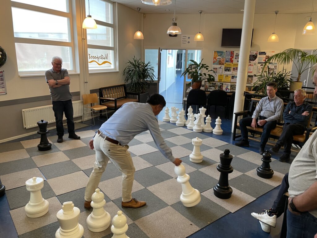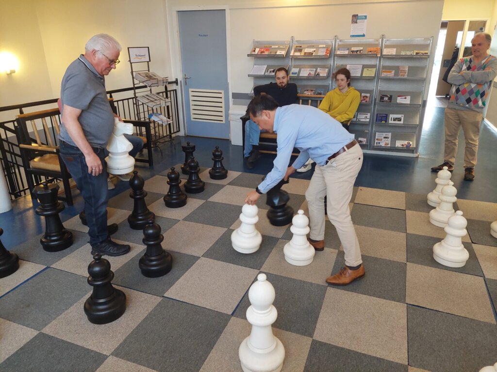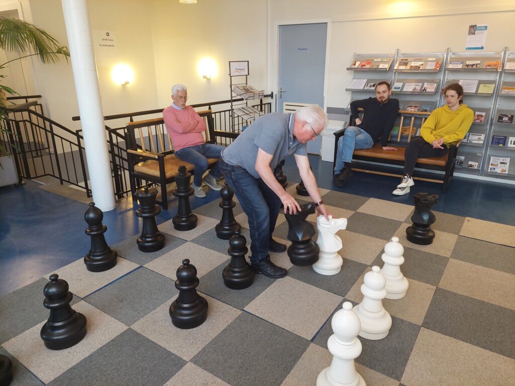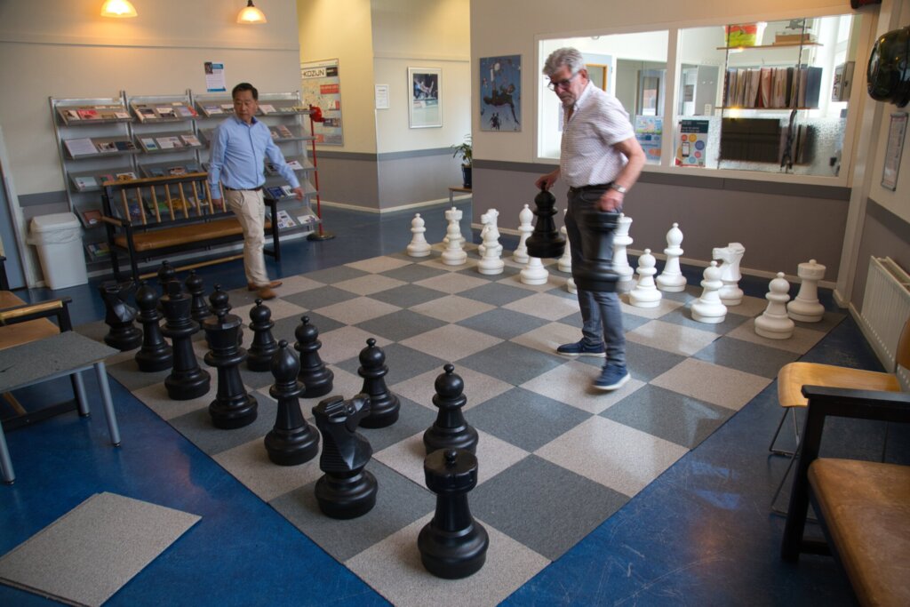 Ondertussen kom er worden geschaakt op een groot schaakspel dat wegens dreigende regen naar binnen was verhuisd.