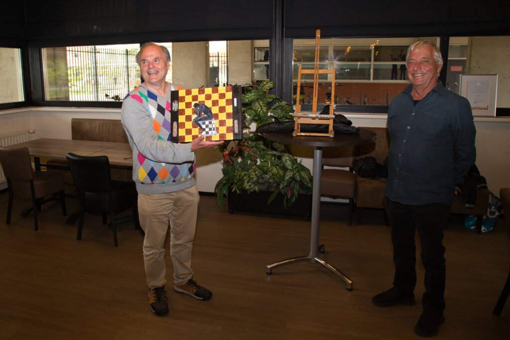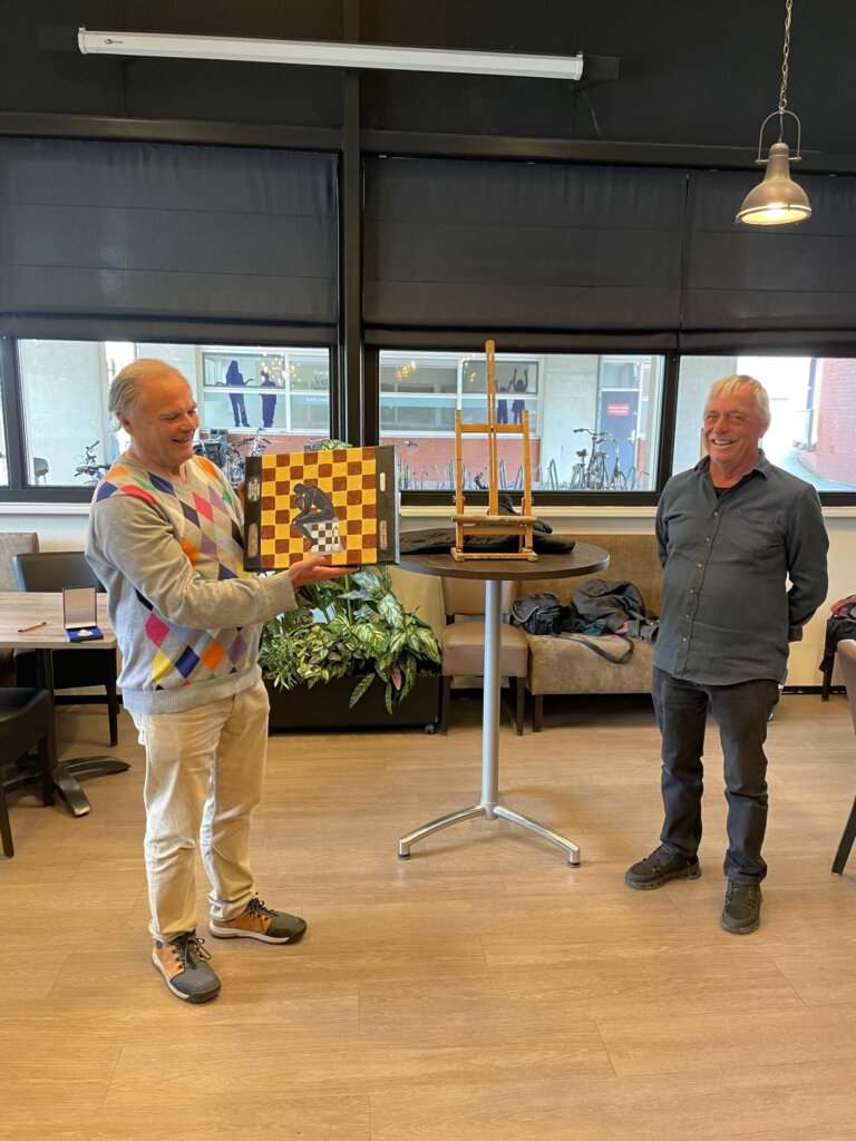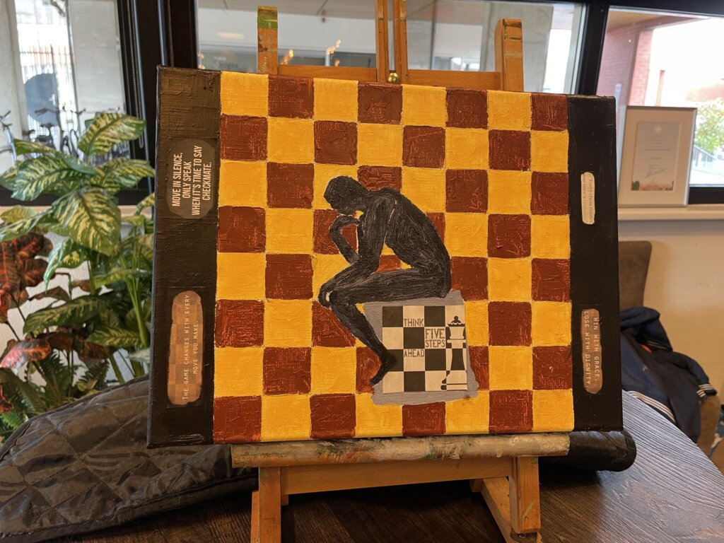Dat was een schilderij, gemaakt door Paul Visschedijk, met De Denker gesitueerd in een schaakbord, omlijst door schaakquotes.