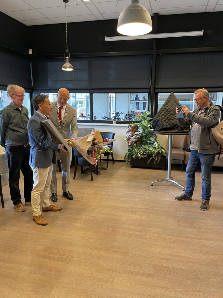 Eva Stok voltrok de loting en Aad Vermeulen was de gelukkige. Hij was er heel erg blij mee.