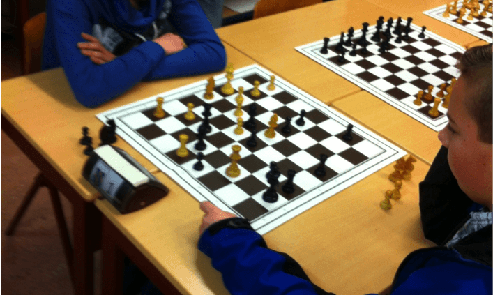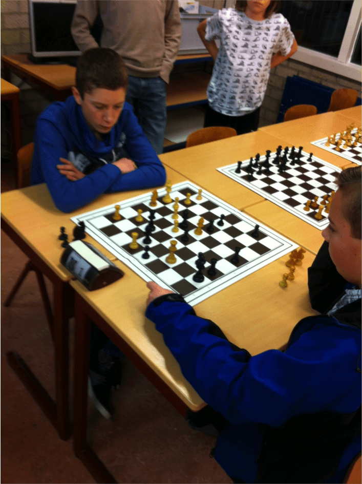In de tweede wedstrijd tegen Pascal 1 was Niek wel bij de les. Na 3 zetten won hij al een toren waarna hij het bekwaam afmaakte. Sil had de eerste partij nog in de benen, want hij verloor snel een toren en de partij. Joas bracht ons weer op voorsprong. Hij won met wit een toren, maar vergat te verdedigen, waardoor zwart een dreigende aanval kon opbouwen. Gelukkig was deze te optimistisch waardoor Joas toch nog eerder kon toeslaan. Helaas wist Milan deze voorsprong niet te verdedigen. Hij kwam een pion voor te staan, maar de stelling was ingewikkeld. In tijdnood liet hij zich flessen. Een teleurstellend gelijkspel dus.