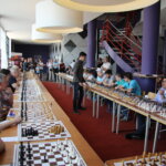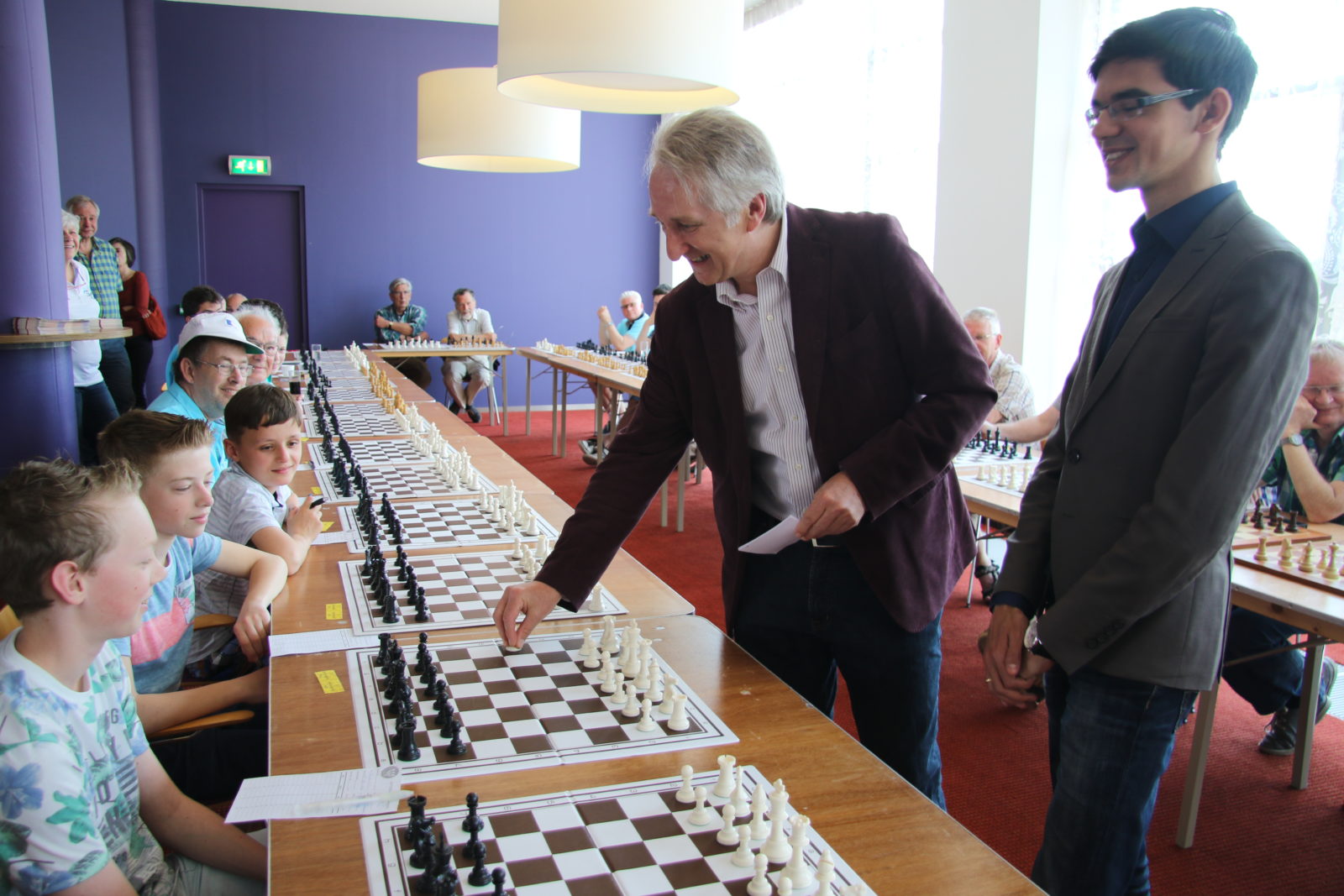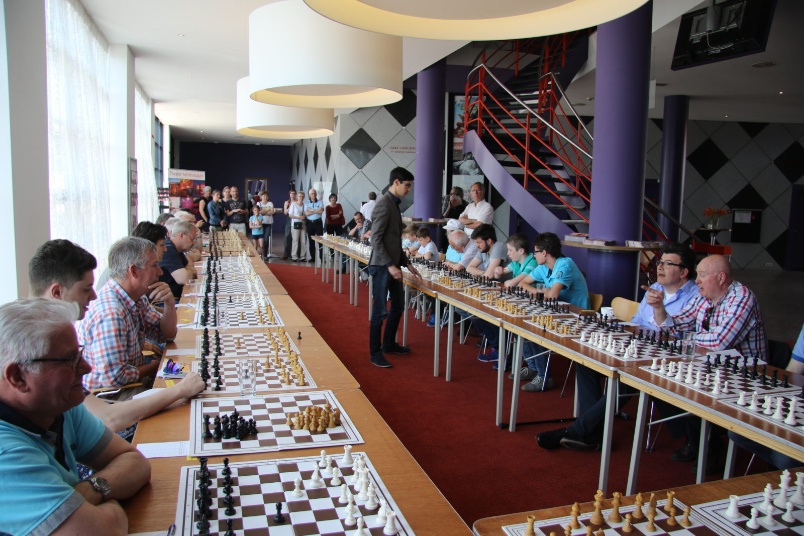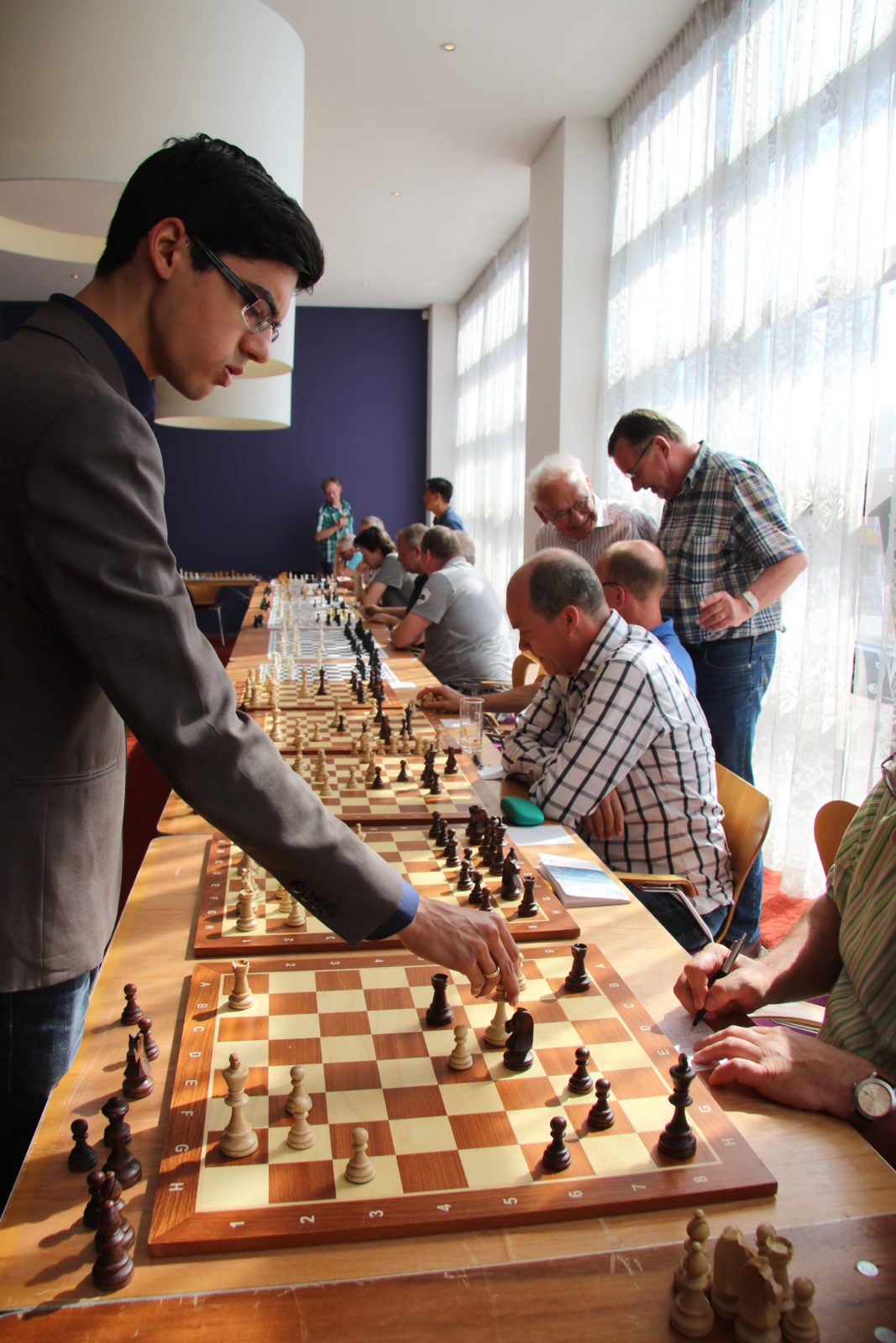 Op zaterdag 7 mei namen 38 schakers, merendeels leden van onze vereniging, het in een simultaan op tegen Anish Giri, Nederlands sterkste schaker en vast lid van de top 10 van de wereld. Dat laatste hebben we geweten, want we werden met 37,5 – 0,5 verpletterd. De enige die met opgeheven hoofd het Kruispunt kon verlaten was Bert Drolenga. Hij sleepte er die enige remise uit. Dat we massaal van het bord gezet werden was natuurlijk ook te verwachten en mocht de pret niet drukken. Hieronder een sfeerreportage.