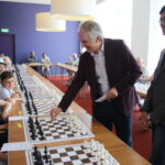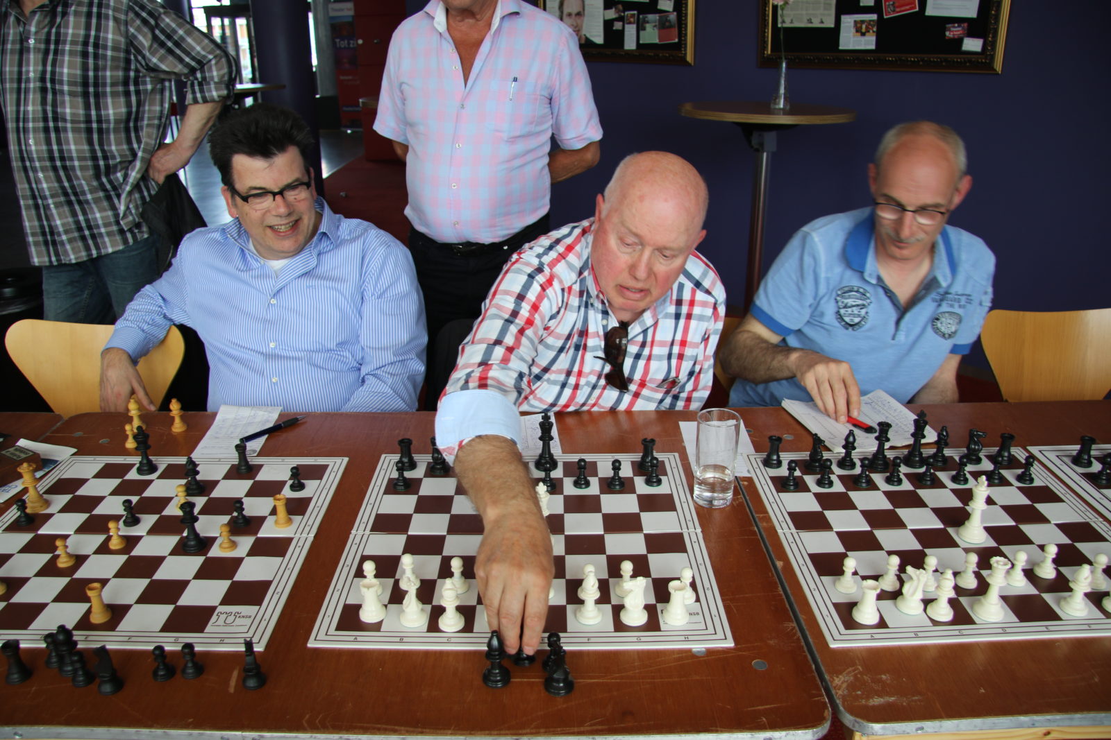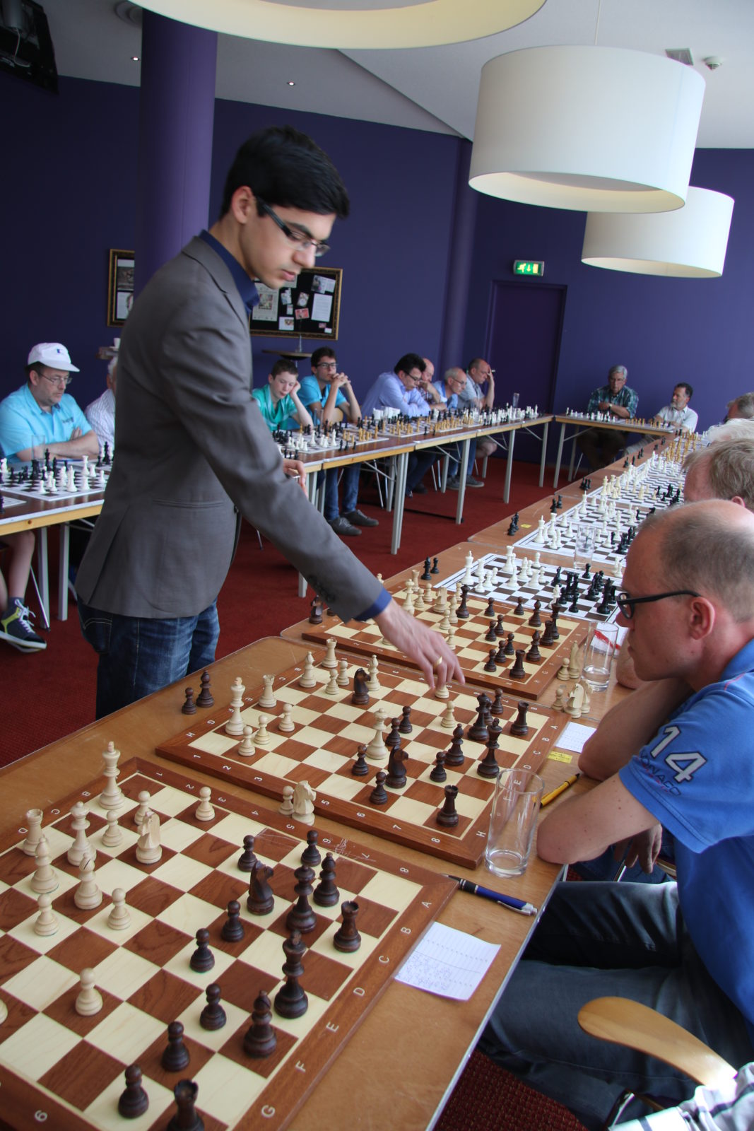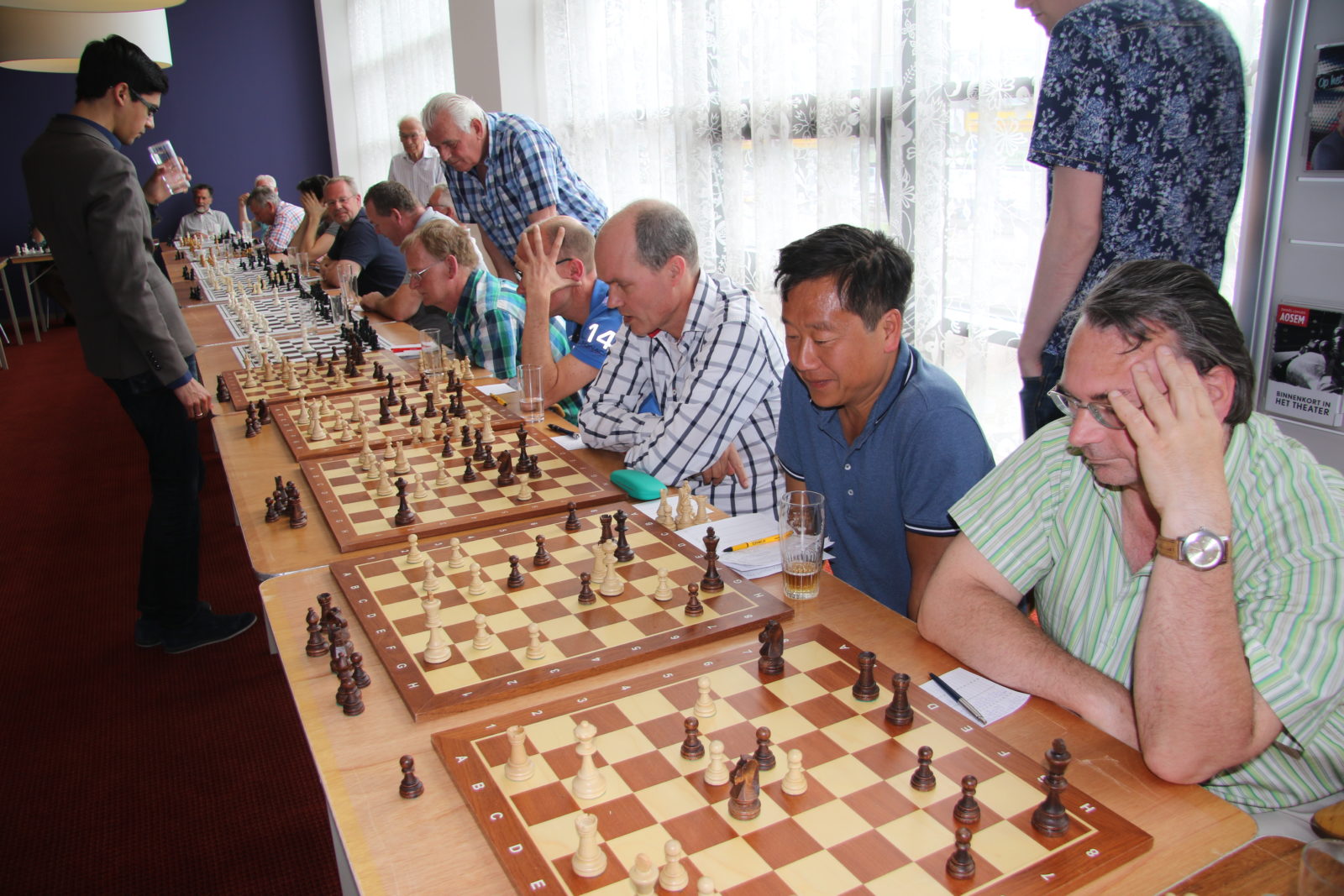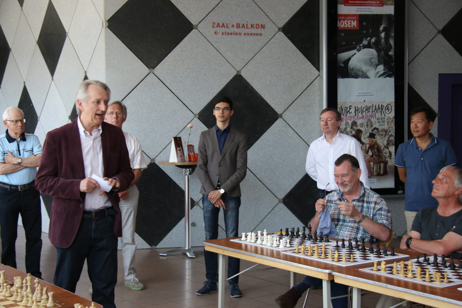 Op zaterdag 7 mei namen 38 schakers, merendeels leden van onze vereniging, het in een simultaan op tegen Anish Giri, Nederlands sterkste schaker en vast lid van de top 10 van de wereld. Dat laatste hebben we geweten, want we werden met 37,5 – 0,5 verpletterd. De enige die met opgeheven hoofd het Kruispunt kon verlaten was Bert Drolenga. Hij sleepte er die enige remise uit. Dat we massaal van het bord gezet werden was natuurlijk ook te verwachten en mocht de pret niet drukken. Hieronder een sfeerreportage.