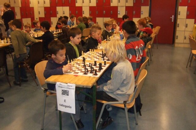 In groep E deed Lisa heel lang mee om de podiumplaatsen. Uiteindelijk greep ze daar door een nederlaag in de laatste ronde net naast. Maar met een score van 7,5 uit 12 kun je thuiskomen! Vlak achter Lisa kwam Richard tot het mooie resultaat van 7 uit 12. Ook Stijn (6,5 uit 12), Annika (6 uit 12) en Stefan (5,5 uit 12) waren goed op dreef. Onze jongste deelnemers, Tim, Phillippe en Minne pakten ook hun punten (namelijk 3,5, 3 en 2,5).