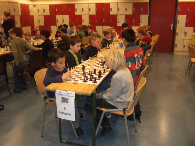 In groep E deed Lisa heel lang mee om de podiumplaatsen. Uiteindelijk greep ze daar door een nederlaag in de laatste ronde net naast. Maar met een score van 7,5 uit 12 kun je thuiskomen! Vlak achter Lisa kwam Richard tot het mooie resultaat van 7 uit 12. Ook Stijn (6,5 uit 12), Annika (6 uit 12) en Stefan (5,5 uit 12) waren goed op dreef. Onze jongste deelnemers, Tim, Phillippe en Minne pakten ook hun punten (namelijk 3,5, 3 en 2,5).