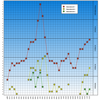 Het succes van het eerste team roept de vraag op: waar gaat dit heen? Hoever kunnen we komen? Is de eerste klasse RSB het hoogst haalbare? Laten we eerst eens naar het verleden kijken. Wat heeft Barendrecht sinds haar oprichting in 1976 gepresteerd in de externe competitie? Onderstaande grafiek (klik erop om hem te vergroten) laat zien dat er hoogtepunten en dieptepunten zijn geweest.